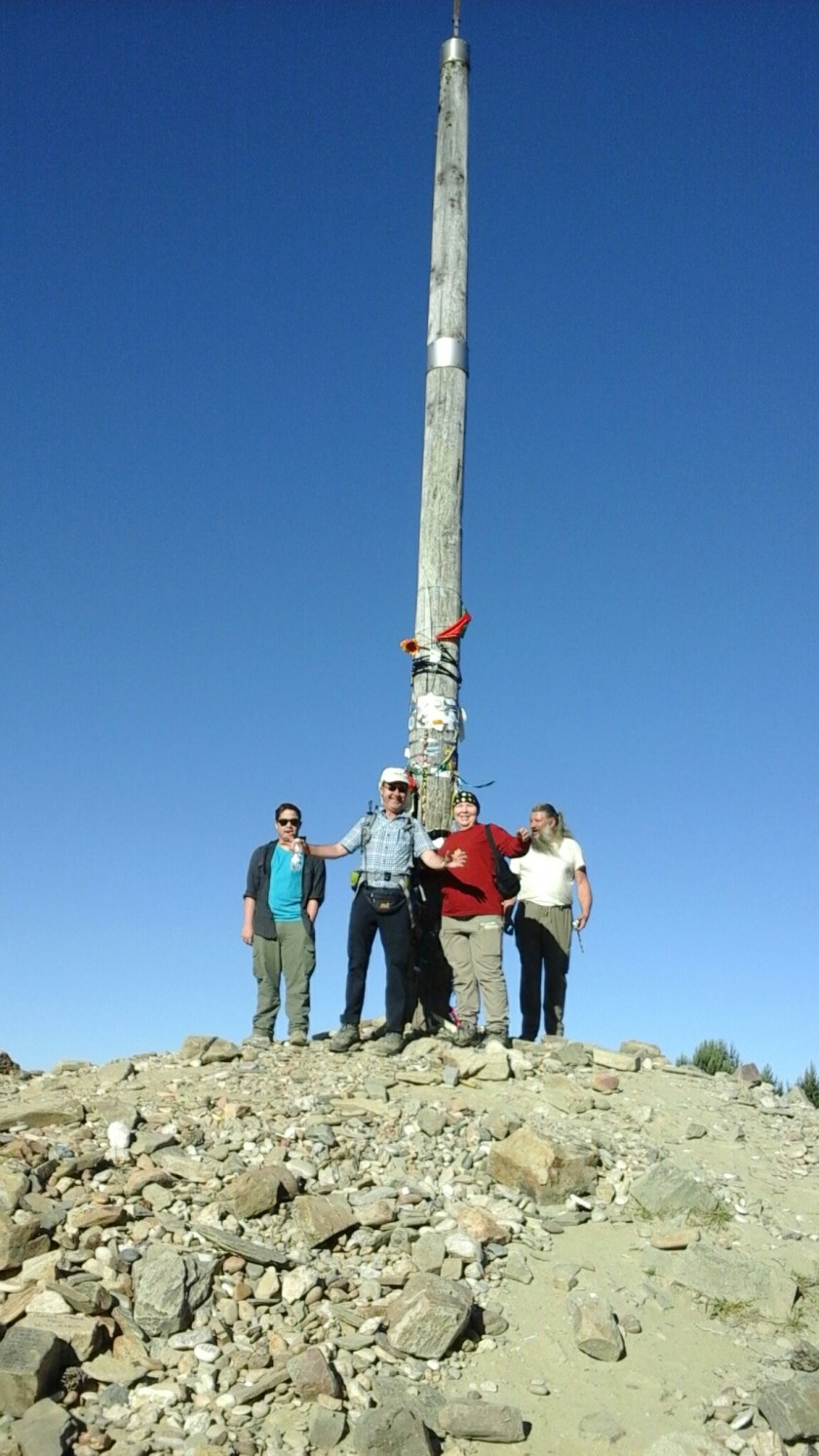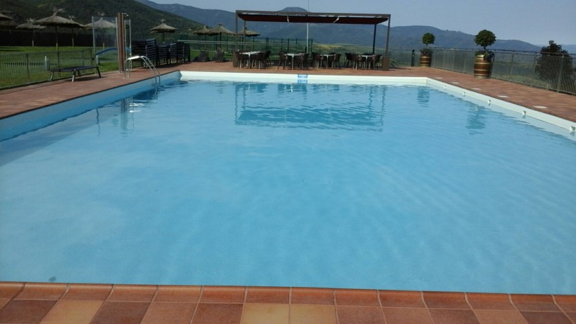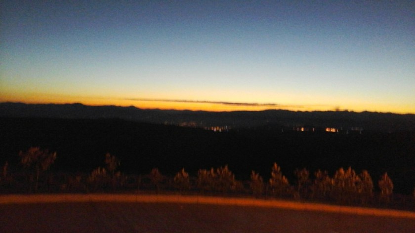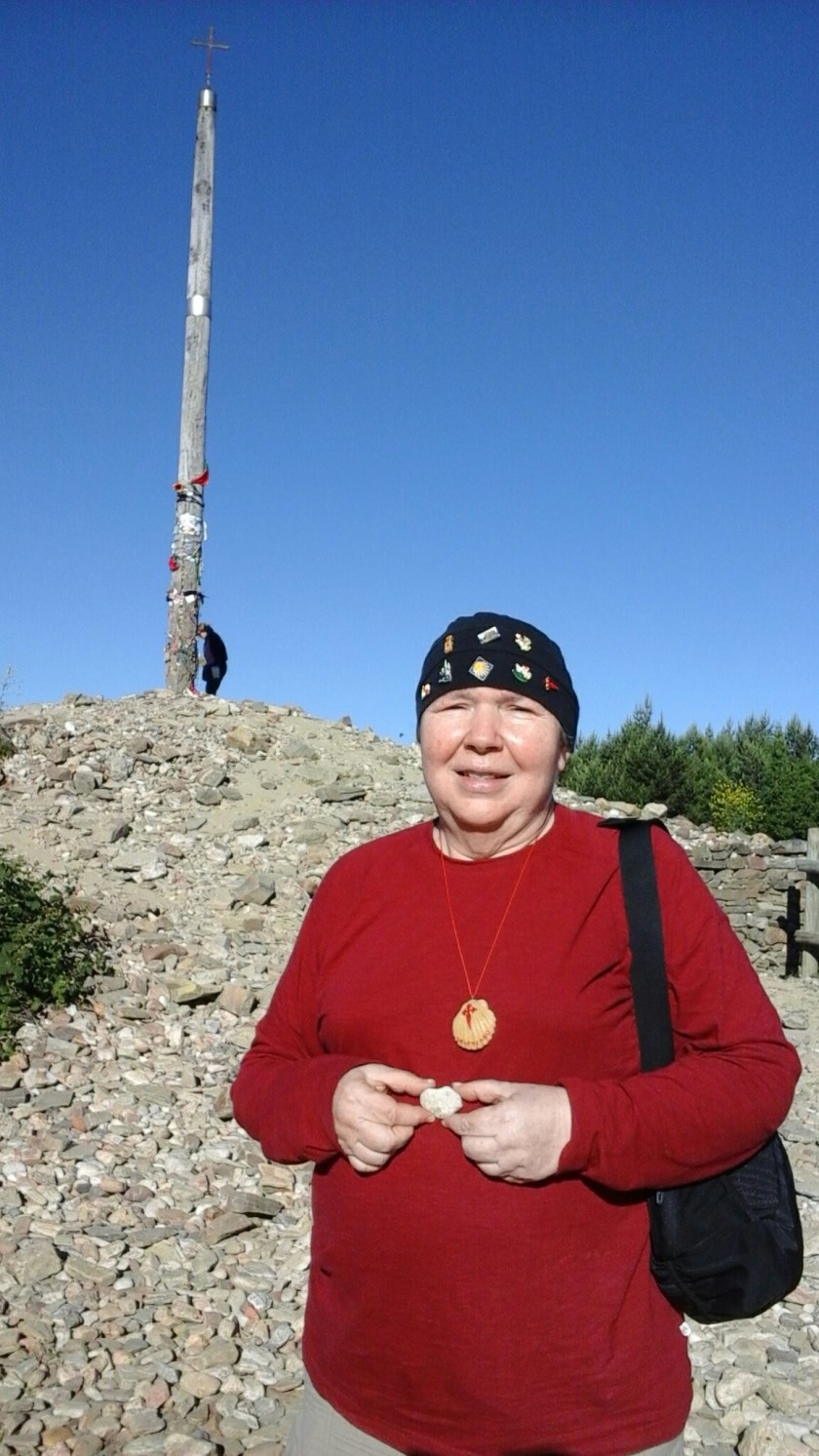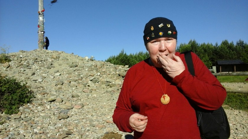 Here is my little rock that I have carried for so many days and miles. In the background you can see the Iron Cross. I have affixed to my cap pins from the various villages and towns in which we have stopped, and I am wearing a shell necklace I picked up along the Way in Roncesvalles.A kiss goodbye to my rock.Here is another photo of us at the Iron Cross. The gentleman is the hat is our pilgrim friend Tom from Germany, whom we once again ran into at the cross. The other man is another pilgrim, a man that Tom had been chatting with.A view from the terrace of our hotel.The pool at our hotel, early morning, before it opens. On Sunday afternoon it was jam packed.Sunset from the terrace. The lights of Ponferrada twinkle far below.