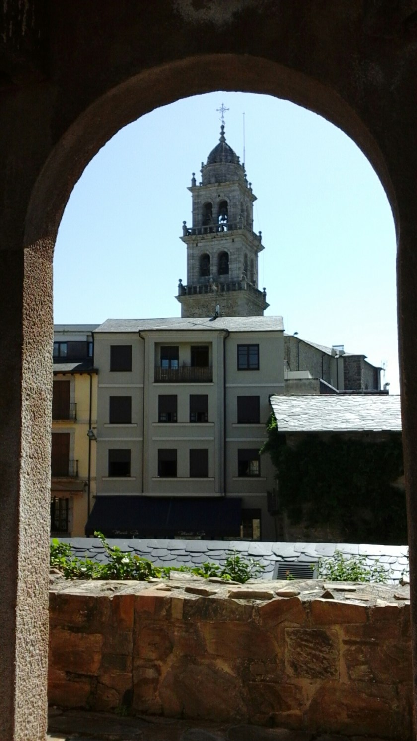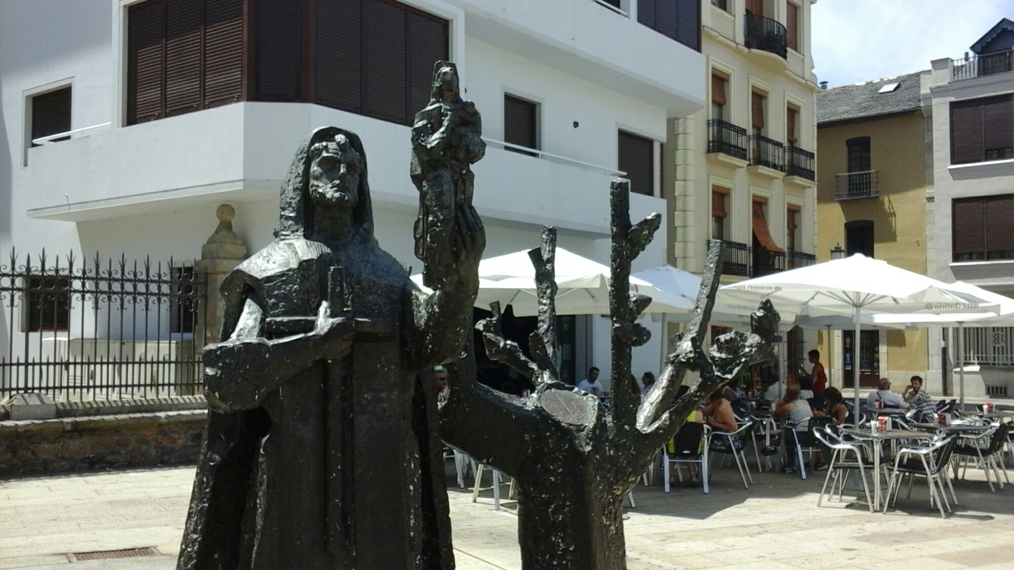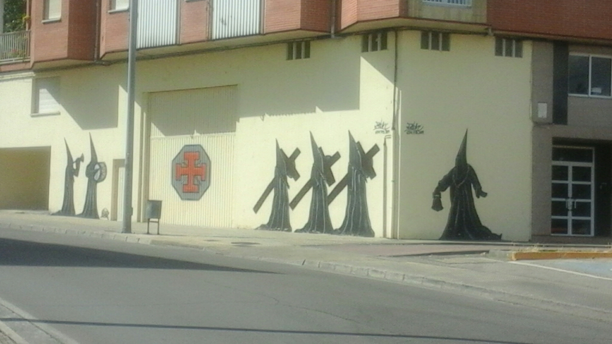 The entrance to the castle. The bridge is permanent now, but you can imagine how a drawbridge, moat, and portcullis would keep attackers out.And trying to attack the castle uphill from the river would also have been suicidal.The castle was expanded over time. All of the keeps and towers look different.Seen through the castle arch, a church partially constructed of stones taken from the castle. We visited that church before lunch, in keeping with my self-imposed rule of never passing by an open church without going in. (So many of them are closed when you want to visit them.)Another church as seen from the castle.A very small cannon that could be fired from the castle. Of course, the appearance of cannons in warfare spelled the end for castles.James on the ramparts.Ponferrada is a town that has intense Holy Week processions. Though it is far from the Lenten season, this cross and cloth combination looked to me very much like what I have seen carried through the streets in Seville and in other Holy Week processions in Guatemala and Chile.And another statuary group that could be beautifully carried through the streets. One of many Pietas I have liked along the Way.A statue and plaque in the square explaining how the Virgin of La Encina was discovered by a Knight Templar.The plaque explains that the image of the Virgin was hidden in a tree cavity at a time when the Moors were attacking the area. Centuries later, when the castle was being built, a Knight Templar found it. The Virgin of La Encina is venerated in this area.James has been startled in Ponferrada to see images which he interprets as images of the KKK. I explained to him that those hooded, robed images do not represent the KKK but rather confraternity or parish members during a Holy Week procession, and that the “uniform” used by the KKK matches this much older one used around the world for religious purposes. I don’t know if the KKK consciously adopted the clothing or not, but given the KKK’s anti-Catholic doctrine I doubt it. Ponferrada, it seems, has many Holy Week processions through the streets with the statues and crosses from various churches, as happens in Seville and elsewhere. And some religious Catholics carry a cross in remembrance of Jesus’s suffering during those processions. In any case, this is not your usual wall paintings or mural.