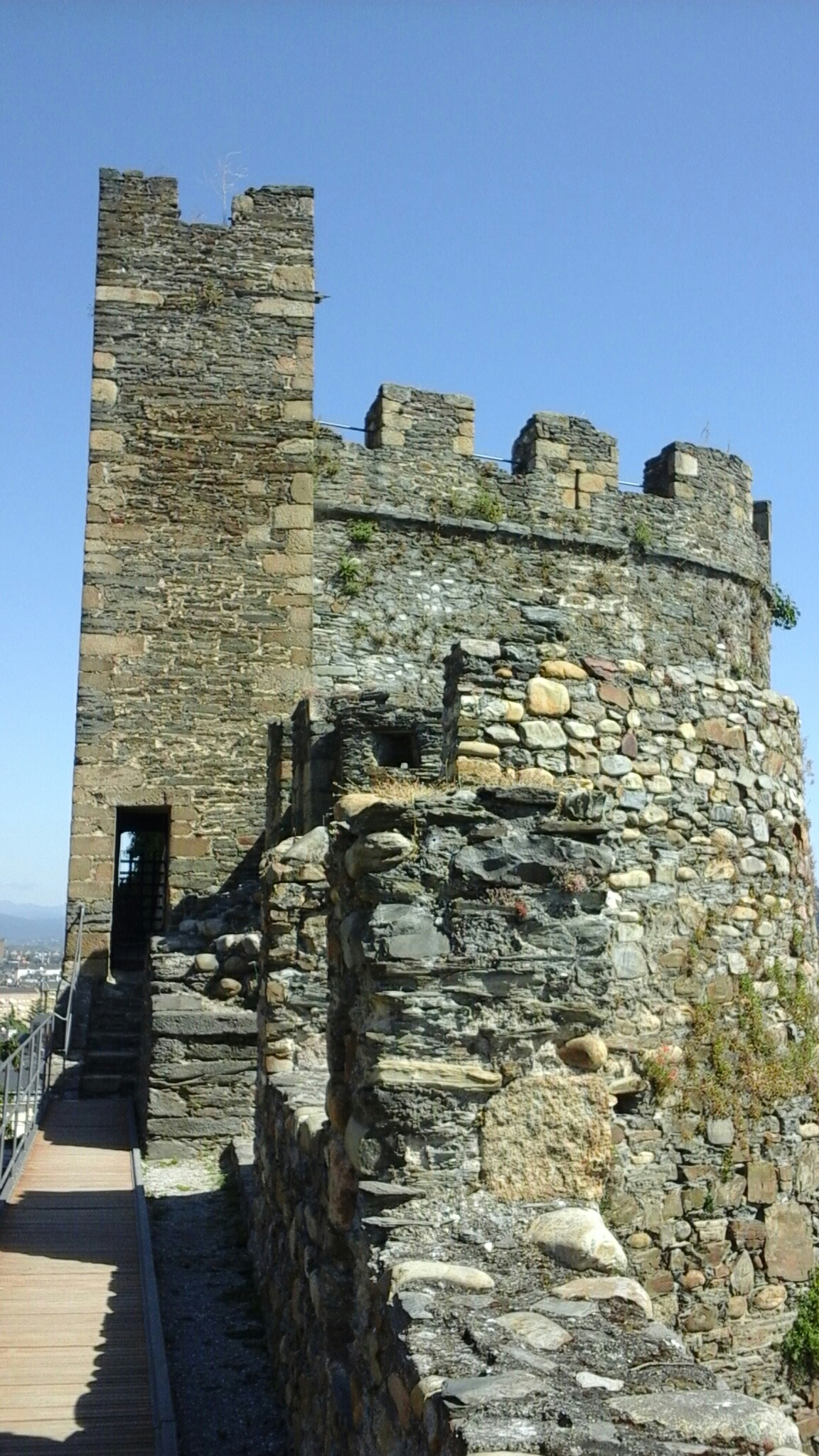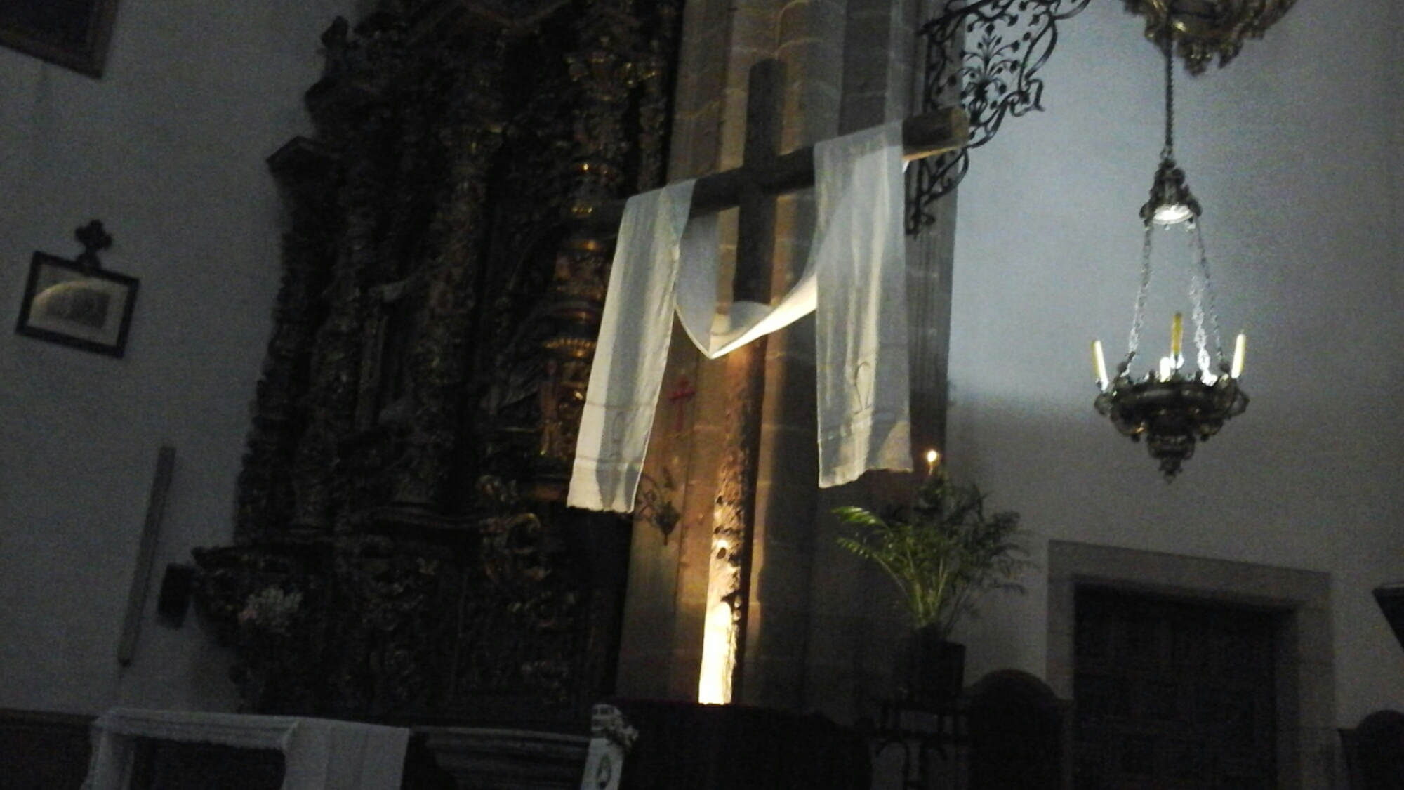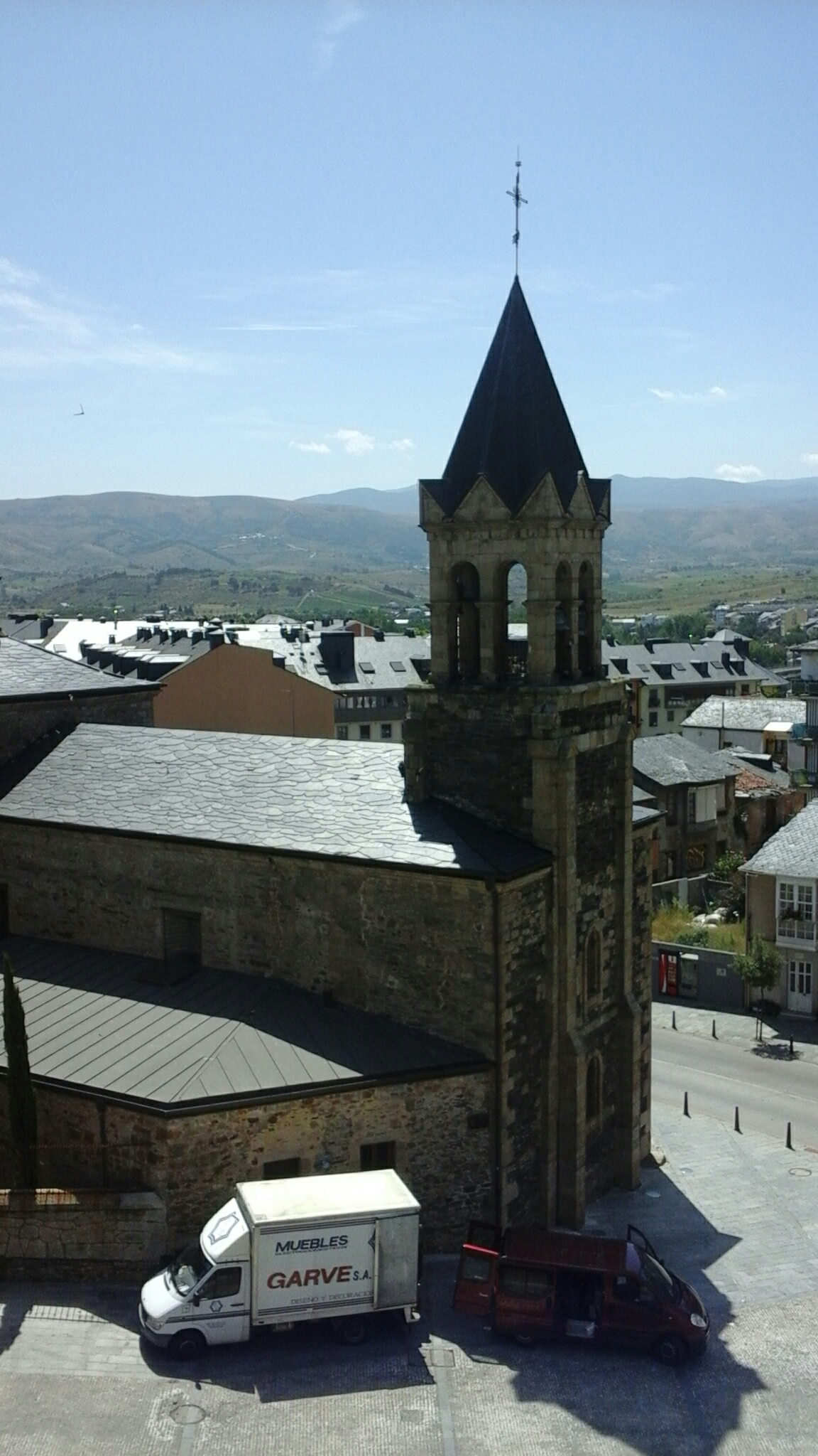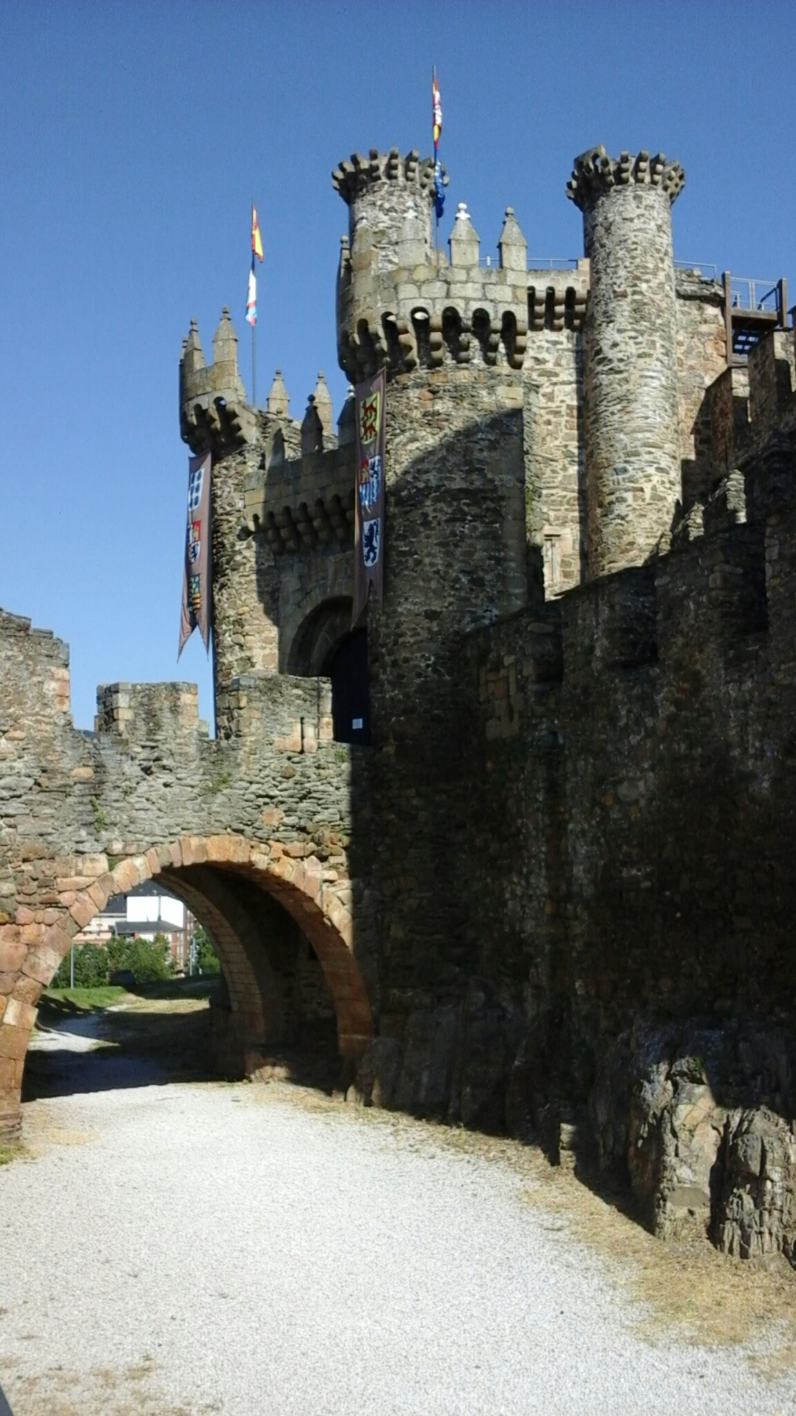 The entrance to the castle. The bridge is permanent now, but you can imagine how a drawbridge, moat, and portcullis would keep attackers out.And trying to attack the castle uphill from the river would also have been suicidal.The castle was expanded over time. All of the keeps and towers look different.Seen through the castle arch, a church partially constructed of stones taken from the castle. We visited that church before lunch, in keeping with my self-imposed rule of never passing by an open church without going in. (So many of them are closed when you want to visit them.)Another church as seen from the castle.A very small cannon that could be fired from the castle. Of course, the appearance of cannons in warfare spelled the end for castles.James on the ramparts.Ponferrada is a town that has intense Holy Week processions. Though it is far from the Lenten season, this cross and cloth combination looked to me very much like what I have seen carried through the streets in Seville and in other Holy Week processions in Guatemala and Chile.And another statuary group that could be beautifully carried through the streets. One of many Pietas I have liked along the Way.A statue and plaque in the square explaining how the Virgin of La Encina was discovered by a Knight Templar.The plaque explains that the image of the Virgin was hidden in a tree cavity at a time when the Moors were attacking the area. Centuries later, when the castle was being built, a Knight Templar found it. The Virgin of La Encina is venerated in this area.James has been startled in Ponferrada to see images which he interprets as images of the KKK. I explained to him that those hooded, robed images do not represent the KKK but rather confraternity or parish members during a Holy Week procession, and that the “uniform” used by the KKK matches this much older one used around the world for religious purposes. I don’t know if the KKK consciously adopted the clothing or not, but given the KKK’s anti-Catholic doctrine I doubt it. Ponferrada, it seems, has many Holy Week processions through the streets with the statues and crosses from various churches, as happens in Seville and elsewhere. And some religious Catholics carry a cross in remembrance of Jesus’s suffering during those processions. In any case, this is not your usual wall paintings or mural.