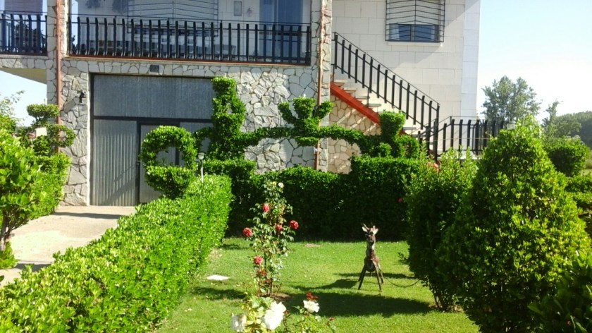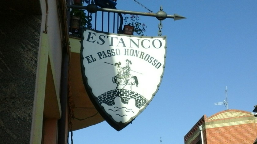 Only in Spain would you see this sign. The staff and gourd identify exactly whom the driver has to be careful to avoid.This is a common method of advertising auberges along the Way. The rock holds down business cards giving the name and location of a hostel in the next town, for those who want to book ahead by cell phone or who need to know where to go.I thought the topiary in this yard we passed was great. That figure on the top of the topiary bridge looks to me like the crown of Leon, but it is probably a Rorschach test for passers-by.A view of the Roman bridge as it spans the river.The shop next to our hotel.
